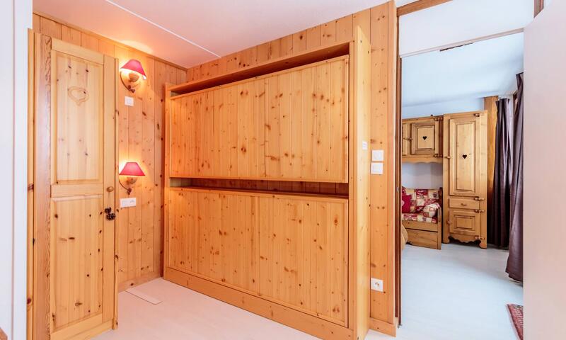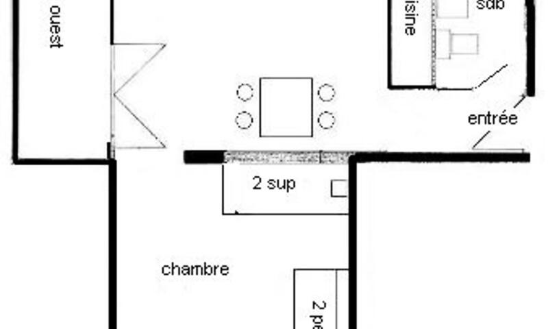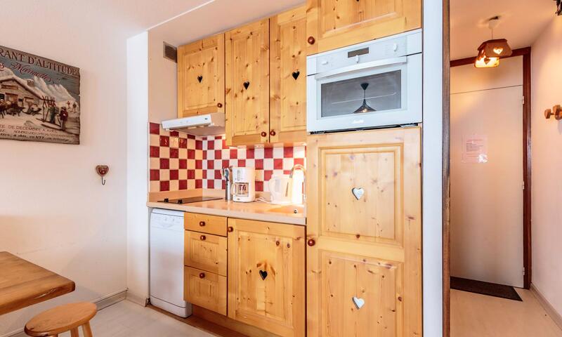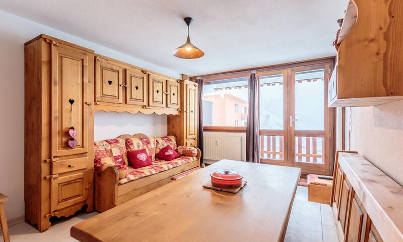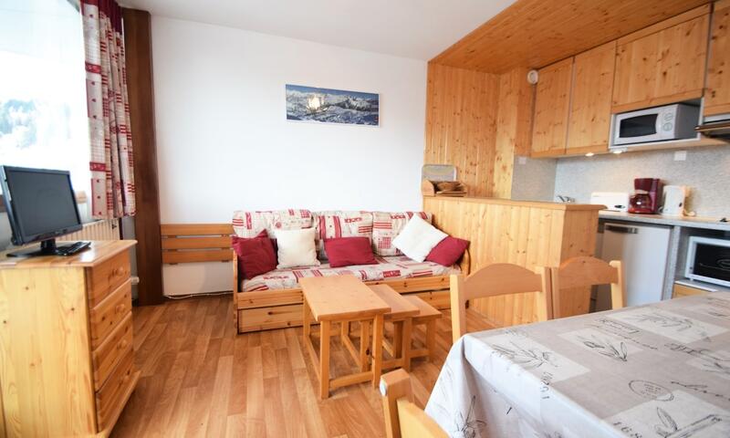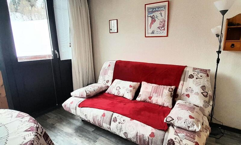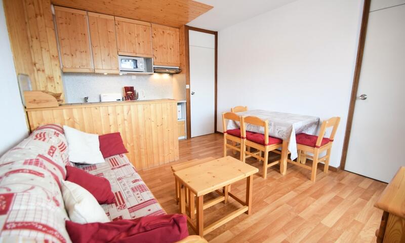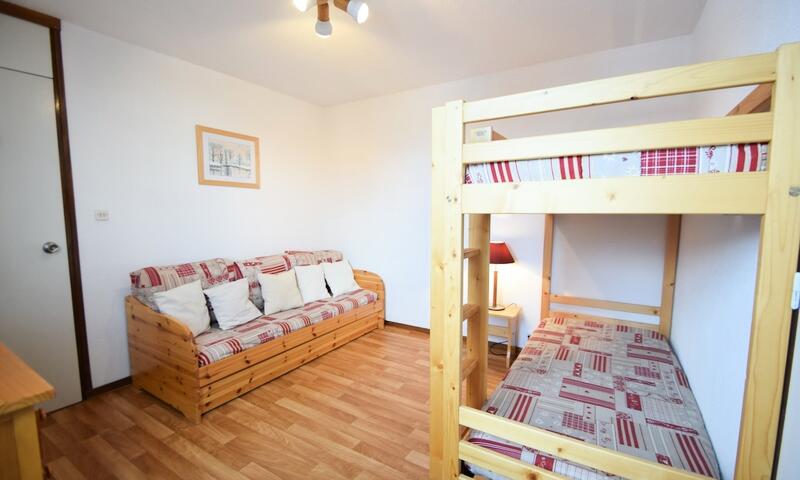 Studio cabine 23m2, 3/4 pers, expo sud, balcon, vue pistes et Grande Rochette  étage 3 sans ascenseur. Cuisine : 2 plaques vitrocéramiques, réfrigérateur, four combiné, lave-vaisselle, cafetière électrique. Séjour : coin repas, canapé-lit type clic clac 2 personnes, télévision. Cabine : 2 lits superposés. Salle de bains : baignoire, WC séparés. Literie : couvertures - Sols : séjour cuisine, sdb, wc : plastique. Appartement non fumeur, animaux non admis. En option et en supplément: Ménage de fin de séjour, draps, serviettes, forfaits ski.