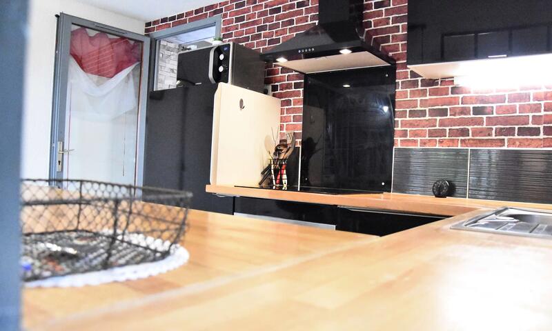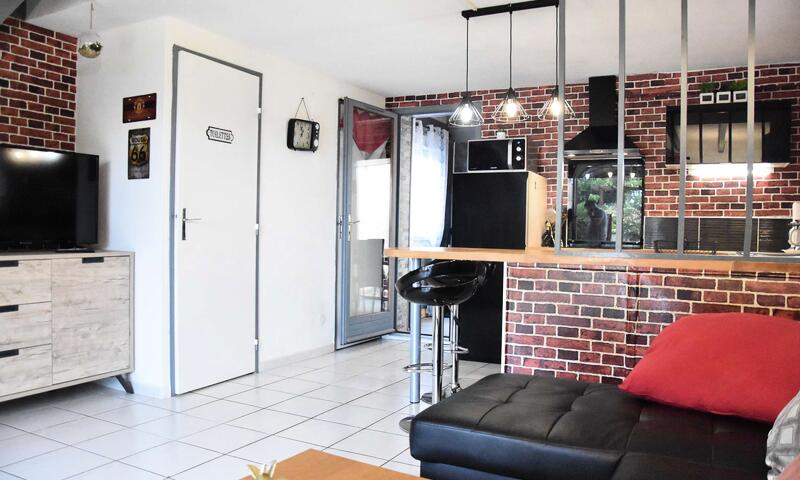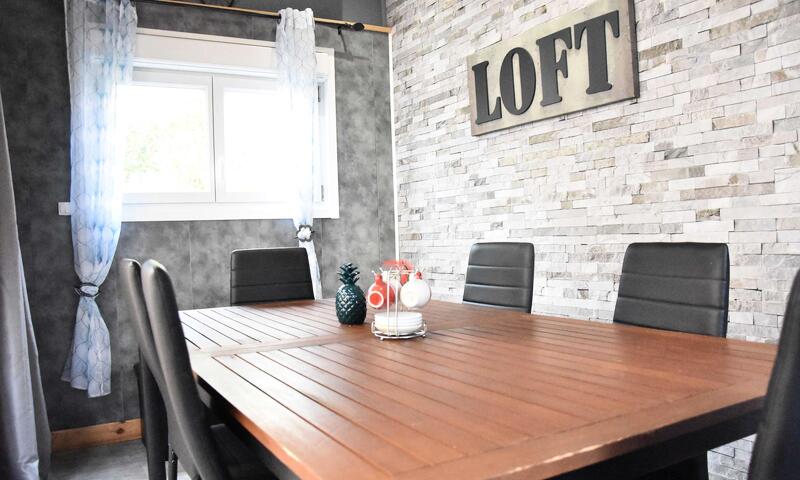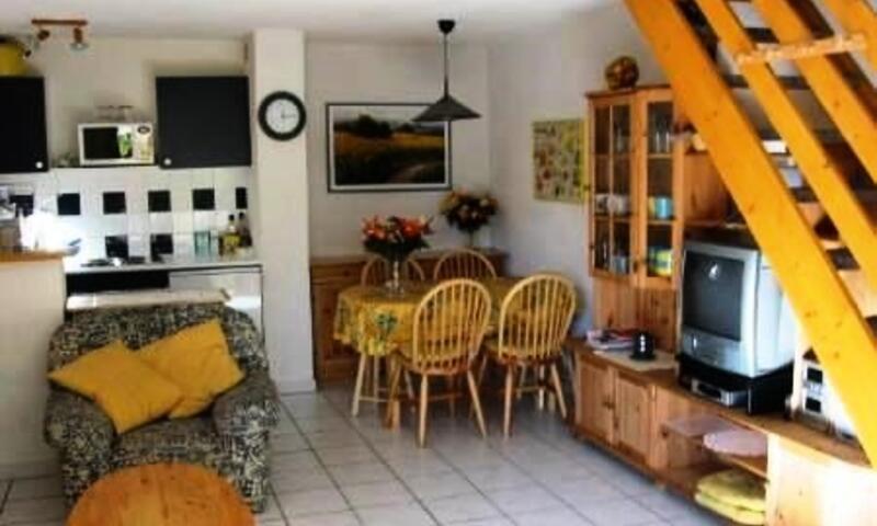 Cette location de maison de vacances , comprend un séjour avec canapé  et télévision, un espace cuisine équipé, un coin repas .