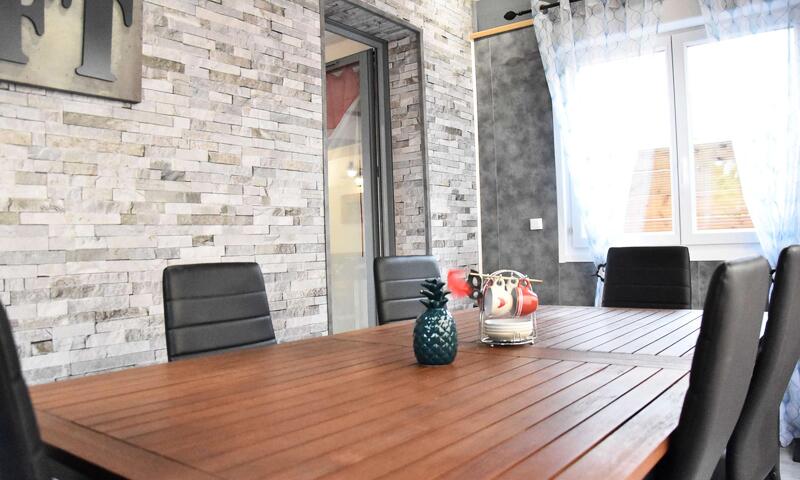 Cette location à la mer, comprend en rez de chaussée,un séjour climatisé avec canapé d'angle et télévision, un espace cuisine équipé suivi d'une véranda aménagée en espace repas, WC indépendant.