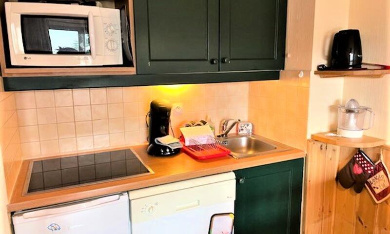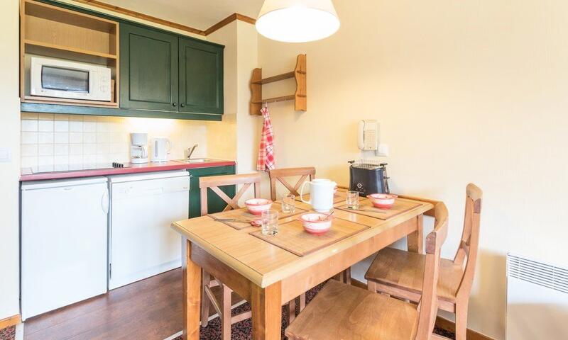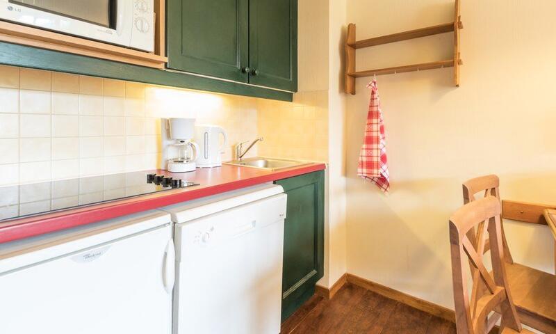 Ce 2 pièces à la montagne comporte: une chambre avec lit double en 140, un séjour avec télévision équipé d'une banquette lit gigogne faisant lit double et un lit simple, une cuisine avec micro-ondes, lave-vaisselle, 4 plaques vitrocéramiques, cafetière, bouilloire. La salle de bain et les wc sont séparés.