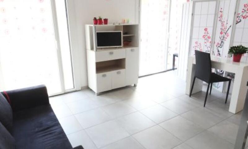 Pièce principale avec cuisine et coin nuit (carrelage) : 1 table, 4 chaises,  1 meuble bas, 1 télévision écran plat, 1 petite banquette, literie en 140cm avec séparation paravent, 3 plaques vitro, four multifonction, hotte  réfrigérateur/congélateur, bouilloire, grille pain, cafetière électrique, vaisselle et batterie de cuisine.