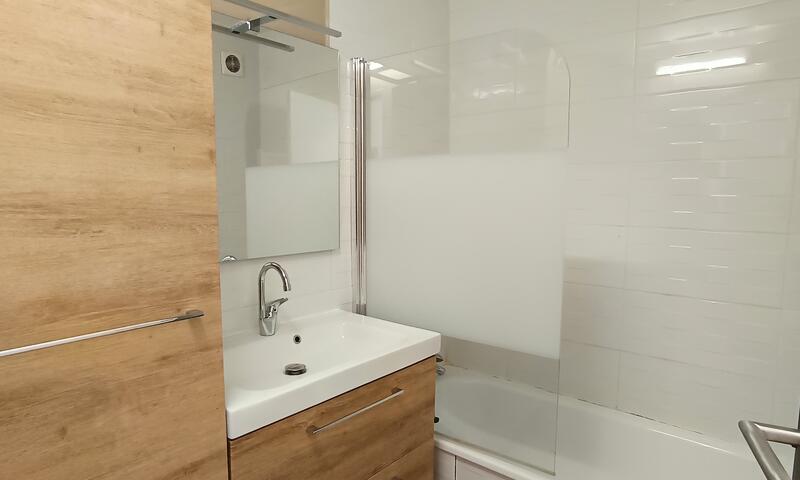 Salle d'eau :  Baignoire moderne avec pare-douche, meuble placard avec vasque, grand miroir, placard de rangement, sèche-serviettes électrique mural seche-cheveux.