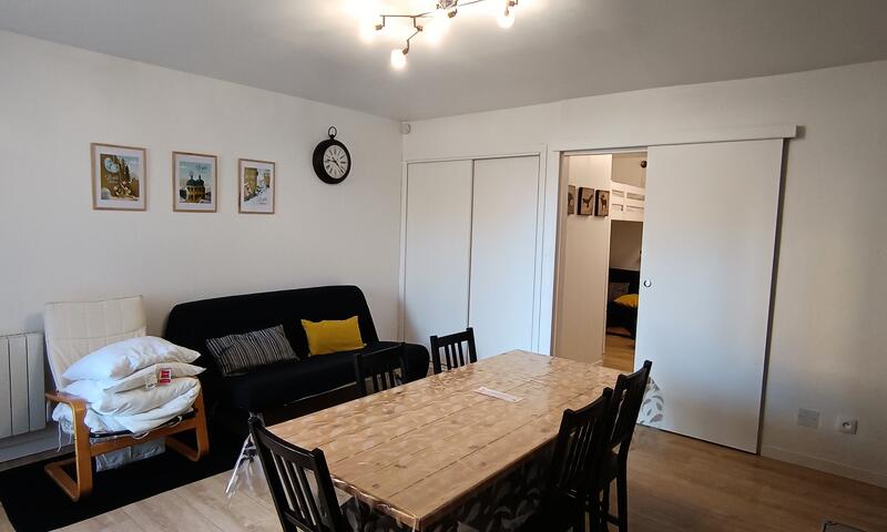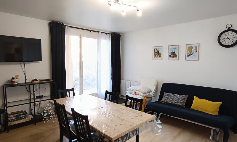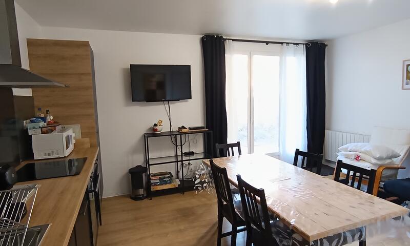 Séjour : 1 canapé, télévision murale, grand placard-penderie, desserte, coin repas avec table et chaises pour 6 personnes, baie vitrée avec accès à la terrasse vue sur les pistes et le Janus, exposition sud-ouest.