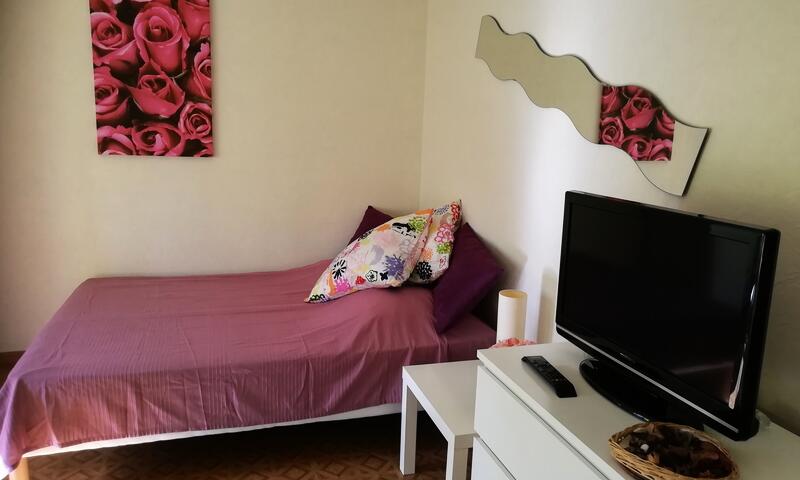 Pièce principale (carrelage) : 1 placard penderie/étagères, 1 lit 140, 1 table, 4 chaises, 1 commode, 1 canapé clic-clac de  130cm, 1  télévision écran plat, 1 table basse pour TV.