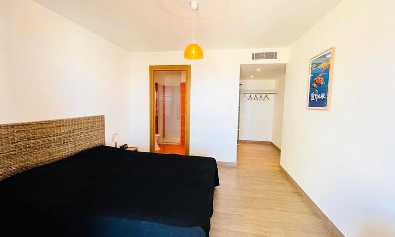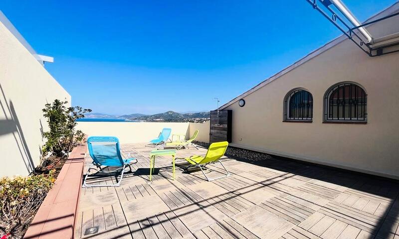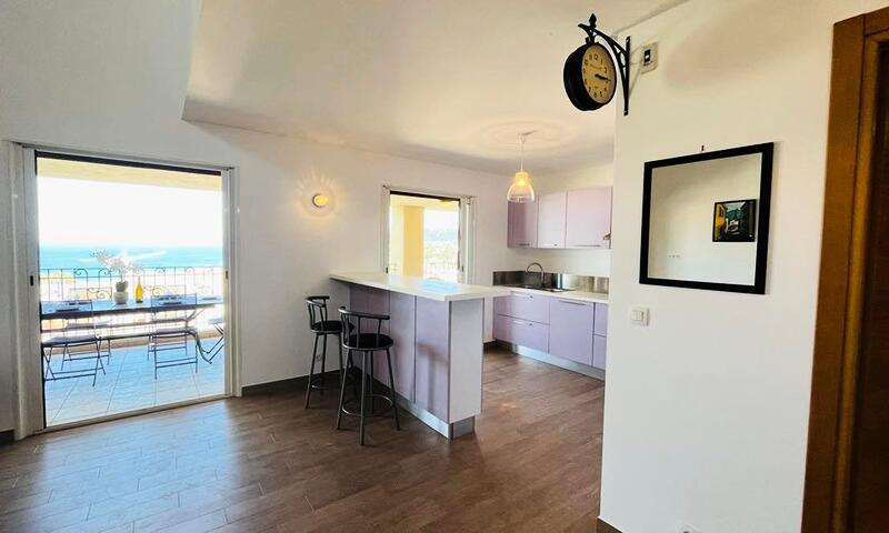 A l'intérieur, nous découvrons un espace jour comprenant une cuisine entièrement équipée, ouverte sur un grand salon salle à manger climatisé, un coin nuit avec une chambre, dressing et salle d'eau donnant sur la terrasse vue mer.