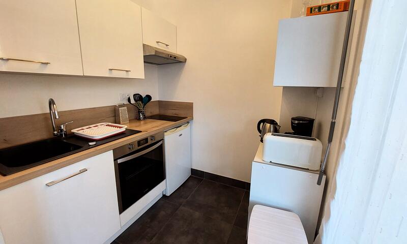Coin cuisine  (sol carrelage) : 2 plaques induction, hotte,  micro ondes, four électrique, évier, réfrigérateur avec petite partie congélation, cafetière électrique, bouilloire, grille pain, vaisselle/batterie de cuisine.