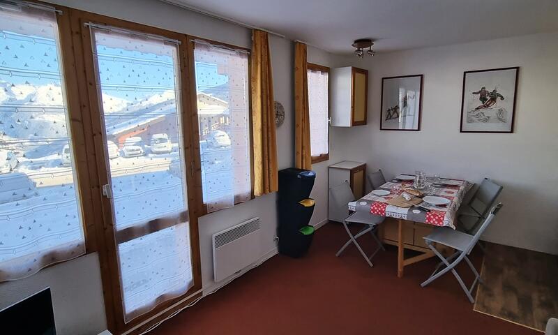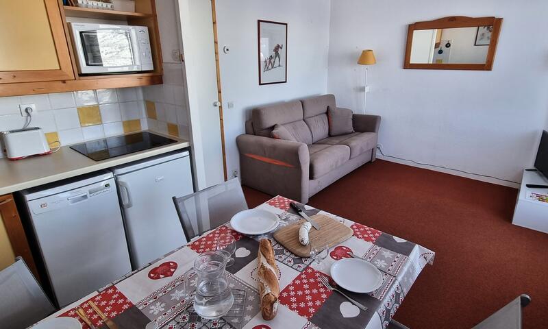 Ce studio est exposé Nord/Ouest et dispose d'une terrasse avec mobilier de jardin et barbecue électrique. Il est equipé d'une kitchenette (avec plaques vitrocéramiques, lave-vaisselle, combiné micro onde, grille pain, cafetière, un coin montagne avec deux lits superposés (en 80cm), et dans le séjour un canapé lit en 140 cm. Salle de bain avec baignoire et WC.