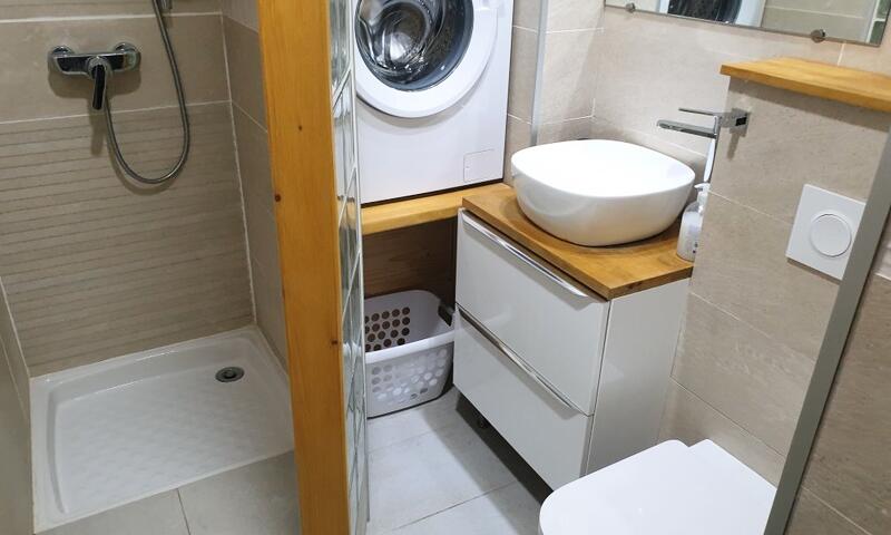Au 2e étage, cet appartement avec aperçu mer se compose d'une entrée, un séjour avec un canapé lit deux personnes, un coin cuisine aménagé et équipé, une cabine avec lits superposés,  une salle de bains avec wc.