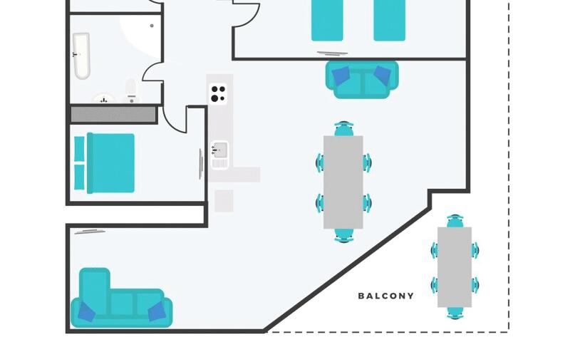 Séjour avec cuisine ouverte, coin salon avec canapé-lit et accès à la terrasse exposée sud.