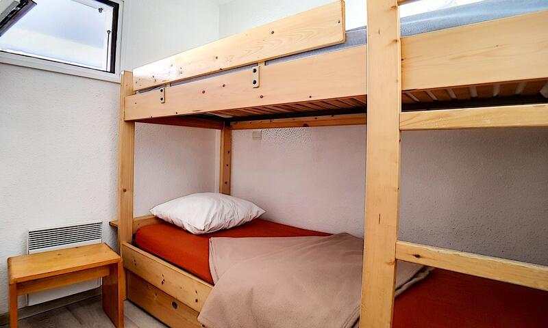 Cabine (séparée du séjour par une porte, avec fenêtre) : 2 lits 1 personne superposés.