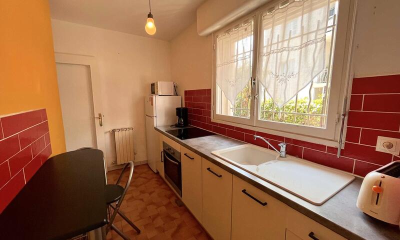 Cette location de vacances est située en rez-de-chaussée et se compose d'un séjour avec un canapé convertible 2 personnes, une cuisine séparée et équipée, une chambre avec un lit 2 personnes, une salle d'eau et un wc.