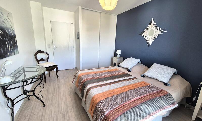 Chambre avec fenêtre Nord (sol pvc) : 1 lits 160cm, 2 chevets, 2 lampes, 1 fauteuil blanc en osier, 1 placard mural avec penderies et étagères, 2 chaises, 1 console.