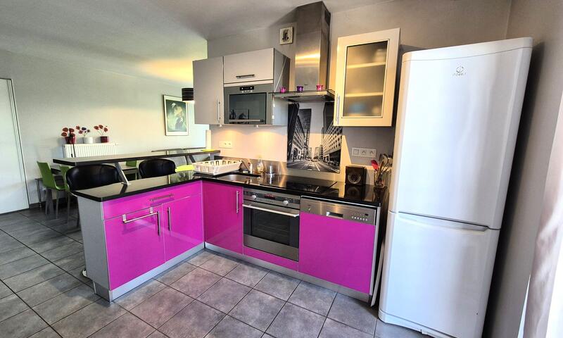 Coin Cuisine  dans séjour : réfrigérateur/congélateur, four pyrolyse, micro ondes, 4 plaques induction, hotte, lave vaisselle, cafetière senséo, grille pain, bouilloire, vaisselle et batterie de cuisine.