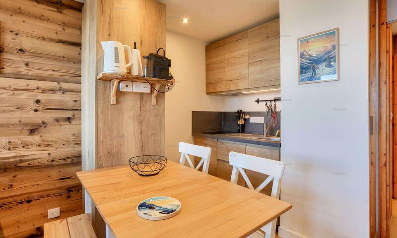 bel Appartement rénové 3 pièces  6 pers. en duplex, 50m2 dont 39m2 loi Carrez, belle vue Vallée, exposé Nord, avec balcon, 3ème étage avec ascenseur puis 1 demi-niveau à monter par escalier - Niv 1 : Cuisine à l'américaine : 2 plaques vitro-céramiques, réfrigérateur, four micro-ondes grill/crisp , Lave-vaisselle, cafetière Nespresso - Séjour divisible par un rideau : coin repas, coin salon avec 2 lits gigognes 1 pers 80cm formant une banquette, TV - SDB : baignoire - WC séparés - Niv 2 : Mezzanine/Chambre 1 : 2 lits 1 pers 80cm -  Chambre 2 : (accès par mezz) : 1 lit 2 pers. 140cm - SDB : douche, WC inclus - Literie : couettes - Sols : lames PVC - Barrières de sécurité en haut et en bas de l'escalier. Casier à skis : N° 321 au RDC sortie sur piste -