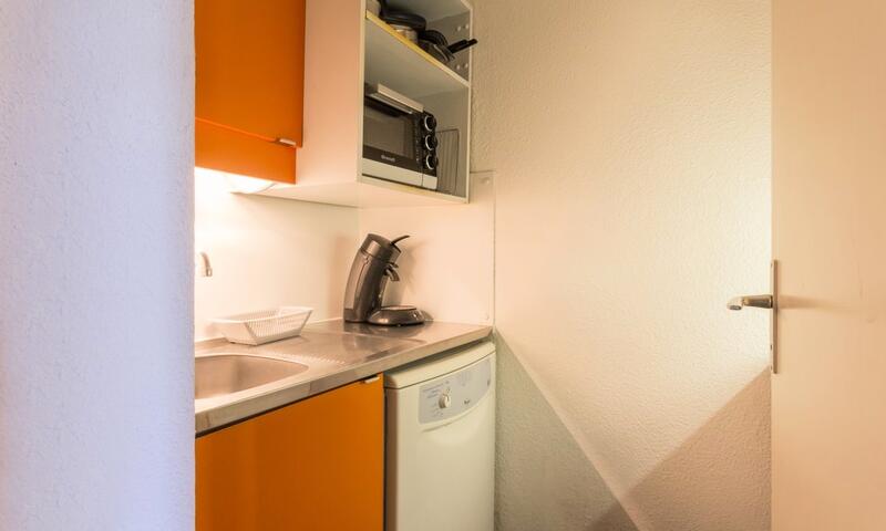 Ce studio divisible en rez de chaussée à proximité des pistes se compose d'une kitchenette équipée (de plaques vitrocéramiques, cafetière, four, micro-ondes, lave-vaisselle et grille-pain), d'une salle de bain baignoire et wc séparé.