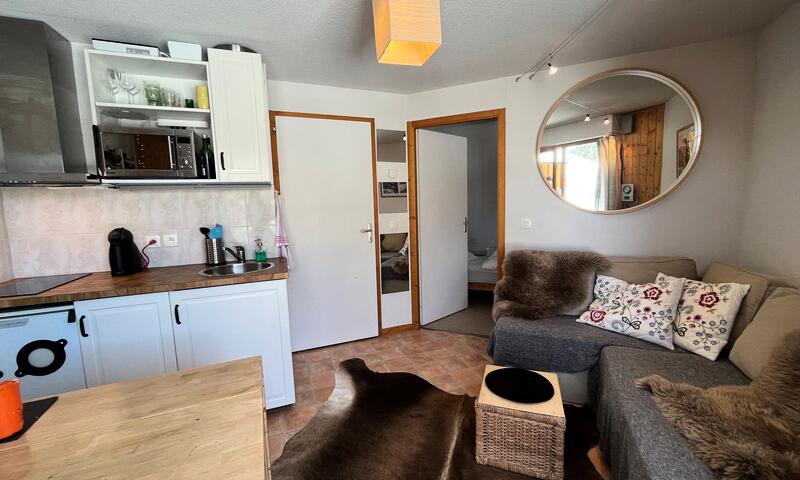 À l'entrée, vous trouverez un coin nuit avec 2 lits simples superposés, une chambre avec un lit double avec 2 matelas simples mais une grande couette, une salle de bain, un WC séparé, un séjour, une cuisine et une terrasse exposée Sud/Est offrant une magnifique vue sur les montagnes.