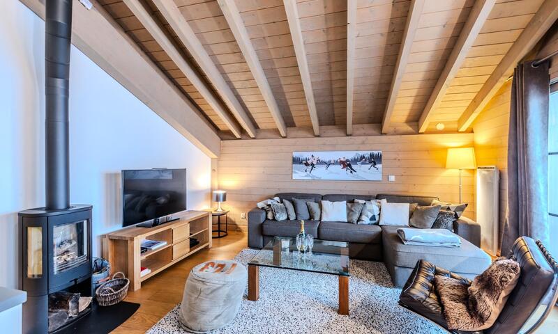 - Salon avec canapé, poêle à bois, accès balcon