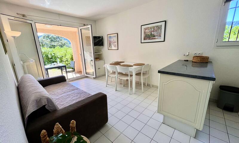 Cet appartement de vacances en rez-de-jardin est composé d'un séjour donnant sur une terrasse avec un canapé-lit deux places, un coin cuisine équipée, une chambre avec un lit deux places, une salle de bains et un w.c indépendant.