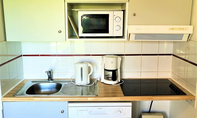 Coin cuisine équipée avec plaques vitro-céramiques, hotte aspirante, réfrigérateur, micro-ondes, lave-vaisselle, cafetière à filtre, bouilloire, grille-pain, machine à raclette, crêpière, nécessaire de vaisselle, aspirateur.