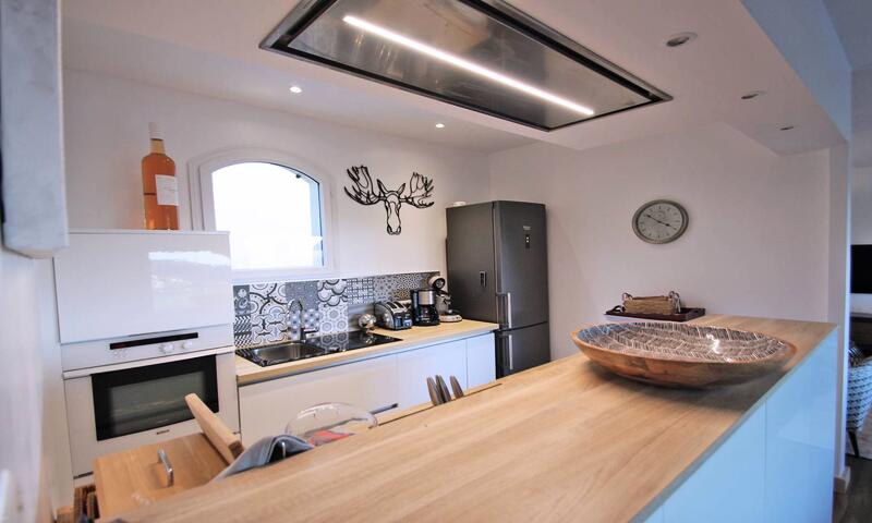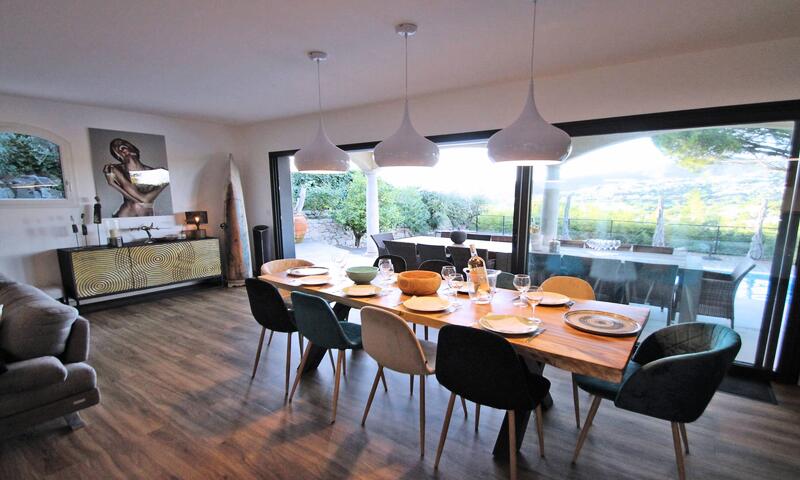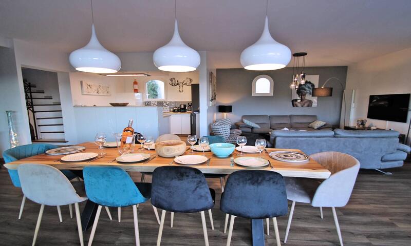 - Belle pièce à vivre donnant accès sur l'extérieur, répartie en 3 espaces : salon avec 2 canapés pouvant accueillir tous les convives, grand écran TV et enceinte bluetooth, le coin repas pour 8 personnes, et la cuisine américaine très bien équipée (réfrigérateur, congélateur, plaques de cuisson, hotte aspirante, lave-vaisselle, four, micro-ondes, vaisselles diverses)