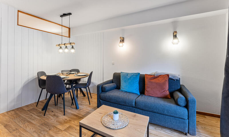 Décoré dans un style de montagne, l'appartement se compose d'un grand séjour avec un  canapé-lit gigogne 2 places et la télévision. De cette pièce, vous accédez à la terrasse et son salon de jardin, pour des petits-déjeuners, apéritifs, etc.