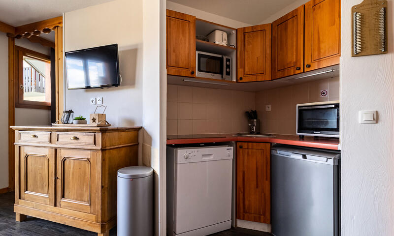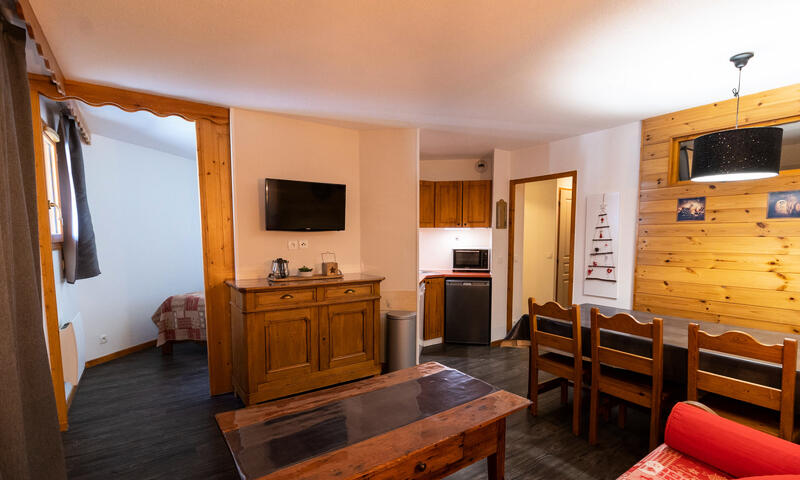 La pièce de vie est pourvue d'une table à manger pour 4 convives et d'un coin salon avec canapé et télévision. La cuisine est toute équipée : réfrigérateur, four, lave-vaisselle, plaque de cuisson, micro-ondes, ustensiles de cuisine, vaisselle, etc... Ce logement a d'ailleurs été labellisé 1 mélèze par l'Office de Tourisme des Orres.
