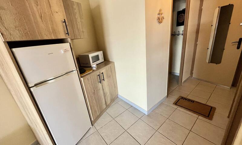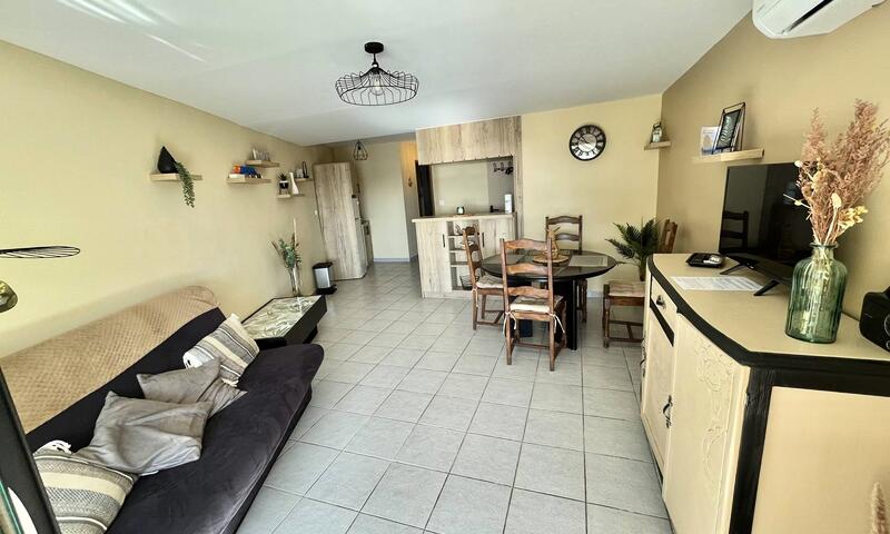 Dans résidence avec ascenseur, superbe appartement T2 cabine, au 2eme étage, climatisé, avec placard dans l'entrée, séjour / cuisine américaine, salle d'eau, wc séparé, 1 chambre separée et un coin cabine, terrasse avec store banne, vue mer panoramique, proximité directe du front de mer, restaurants, animations et plages ! Stationnement gratuit à proximité, capacité 3/4 personnes,  station balnéaire familiale paisible avec des grandes plages de sables fin, commerces de proximités à - de 500m