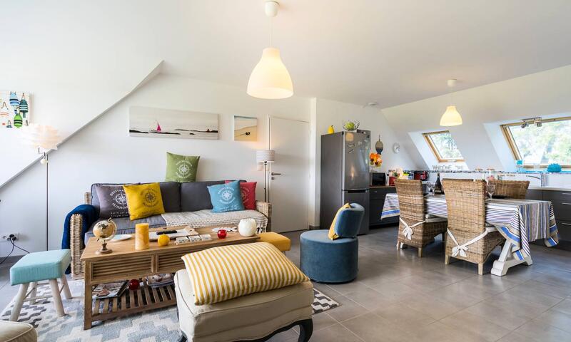 A proximité centre de Plouharnel et du célèbre sentier des douaniers (GR34), dans un environnement calme, très bel appartement 3 pièces (env.65m²) pour 4 personnes, à la décoration soignée, situé dans la résidence LES LANDES DE KERCROC (1er étage, porte 14) :