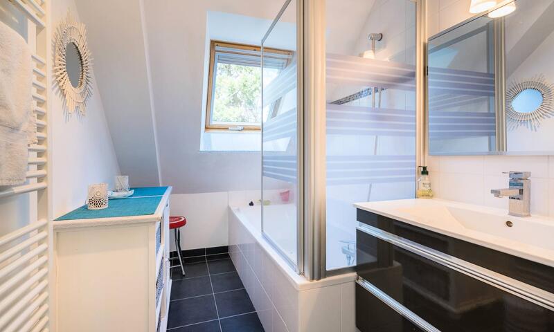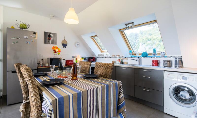 - Cuisine ouverte avec partie repas (table + chaises) et équipement (plaque vitro 4 feux, frigo avec congélateur, four, micro-ondes, lave-vaisselle, lave-linge, cafetière Nespresso)