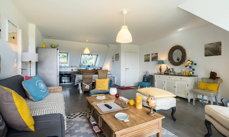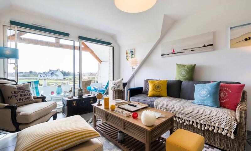 - Séjour avec partie salon (canapé, fauteuils, TV) donnant sur la loggia exposée Sud offrant une jolie vue sur la Baie de Plouharnel
