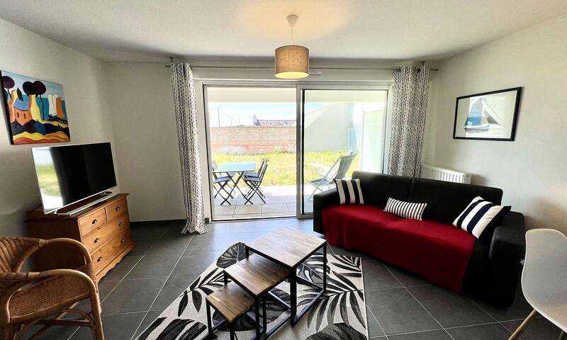 Séjour lumineux avec canapé convertible 2 places en 140 (couette), télévision et accès Wifi gratuit, grande baie vitrée donnant sur une terrasse privative et un jardin collectif, non clos & exposé Ouest (mobilier de jardin, chaises longues)