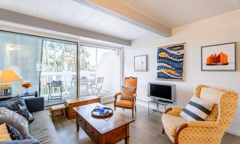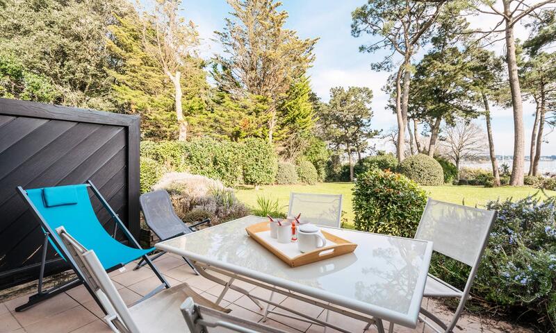 Surplombant le port de La Trinité-sur-Mer, dans un environnement de pins, à 500m  des commerces, et à 1,5 km de la Plage du Port, bel appartement 2 pièces (env.35m²) pour 4 personnes,  situé dans la résidence LES TERRASSES DU PORT (Bâtiment A, RDC, porte 0.02) :
