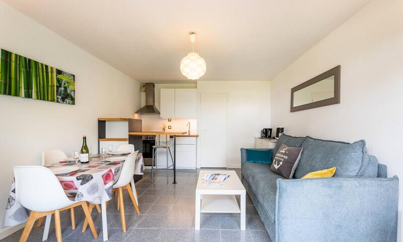 - Séjour avec partie repas (table et chaises) et partie salon (canapé, fauteuils, TV) donnant sur balcon orienté Est avec vue sur le port (salon de jardin)