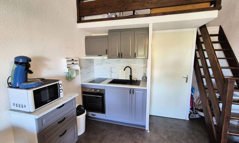 -Plaques de cuisson (3 feux électriques), hotte aspirante, mini-four, micro-ondes, frigo-top (pas de congélateur), cafetière (à filtre), bouilloire, grille-pain
