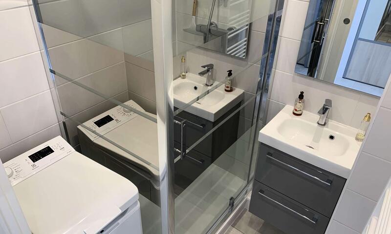 Salle d'eau avec douche, lave-mains et lave-linge.