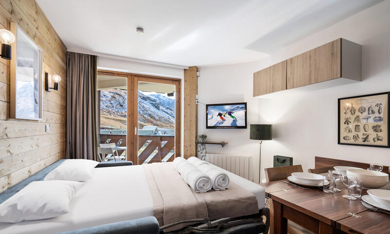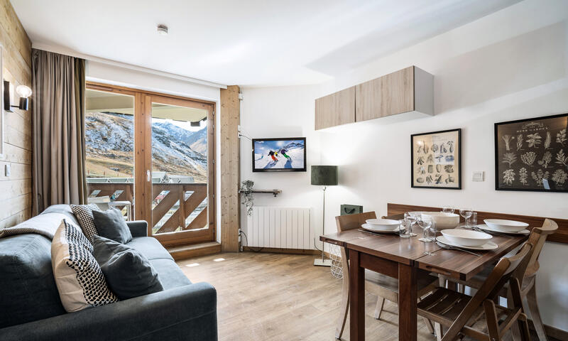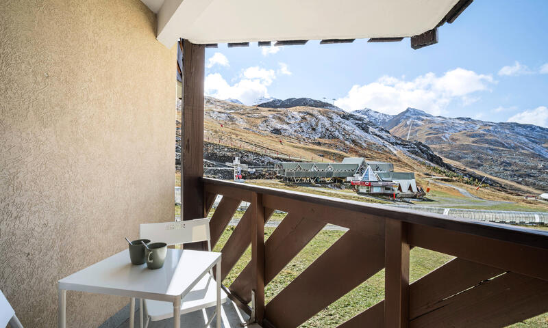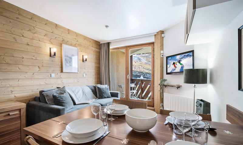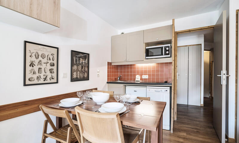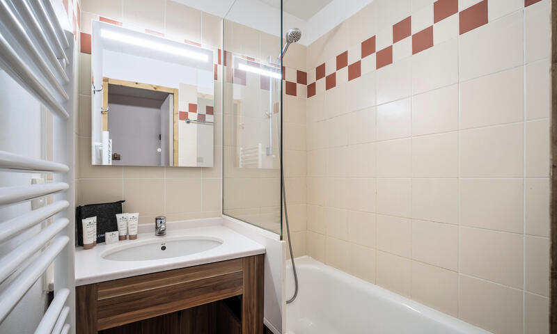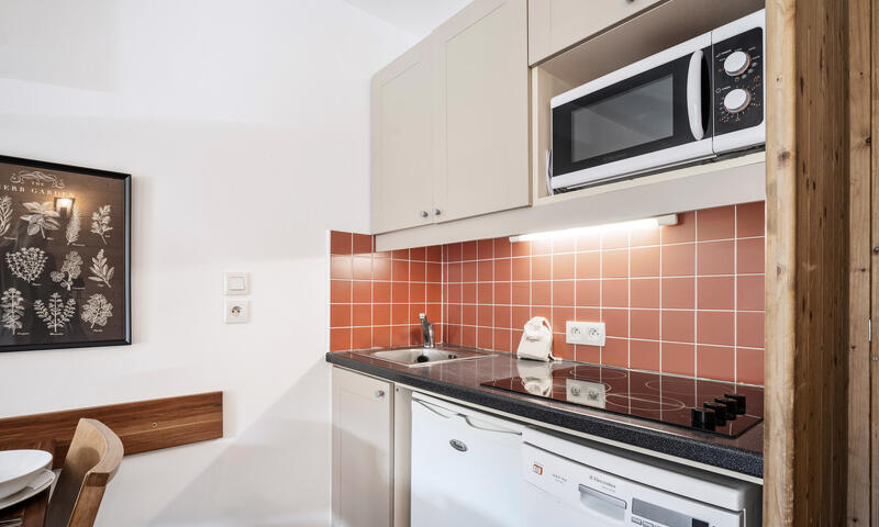 Appartement avec chambre séparée de 27 m² à Val Thorens pour 4 personnes offrant un espace moderne et chaleureux avec une vue sur les pistes et les montagnes. La cuisine et le mobilier se parent de couleurs contemporaines, créant une atmosphère accueillante. La salle de bain, équipée d'une baignoire et d'une douche, est accompagnée de toilettes séparées pour plus de commodité.