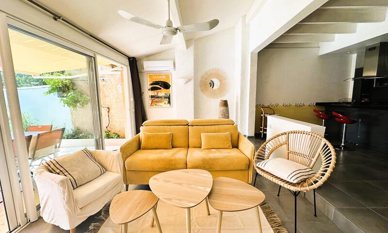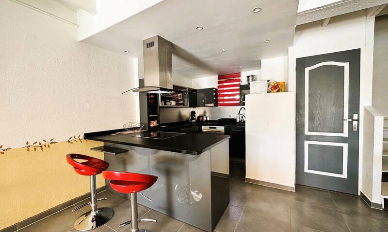 Au niveau principal, un séjour avec Tv et wifi, une cuisine américaine entièrement équipée, un coin repas et un wc.