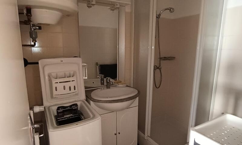Salle d'eau : Cabine de douche, meuble avec vasque, miroir, lave-linge, chauffe-eau.