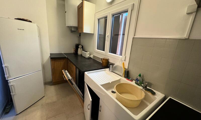Cuisine indépendante avec fenêtre : Réfrigérateur + congélateur, cuisinière induction, hotte aspirante, four + grill, lave vaisselle, nombreux accessoires de cuisine, rangement, cafetière, grille-pains, bouilloire.