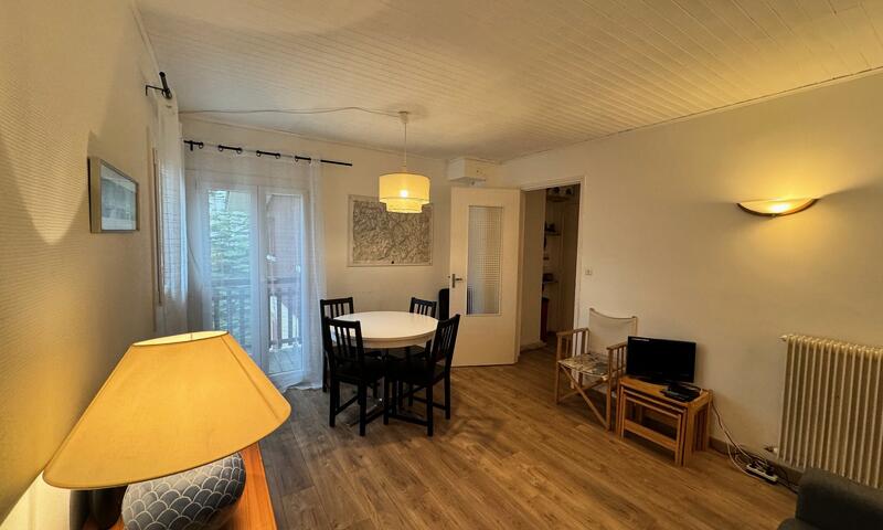 Séjour : Petite télévision, canapé, buffet, coin repas avec table et chaises, accès petit balconnet au sud ouest