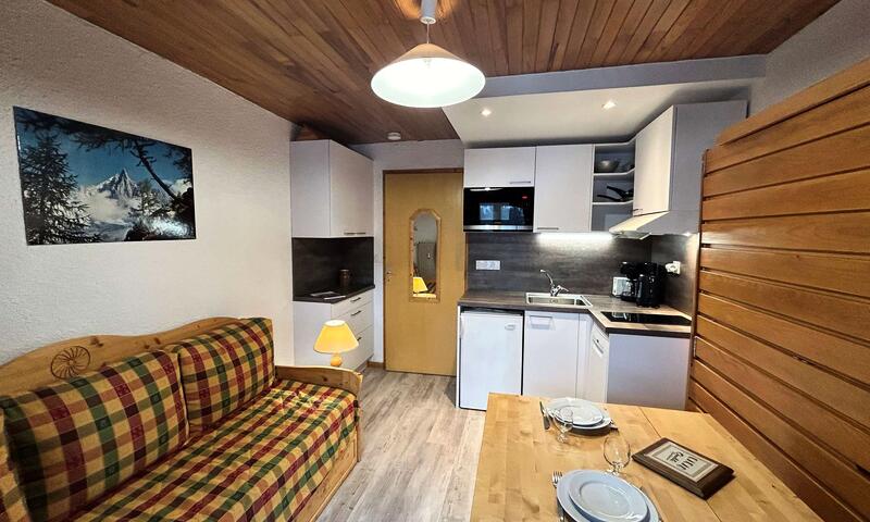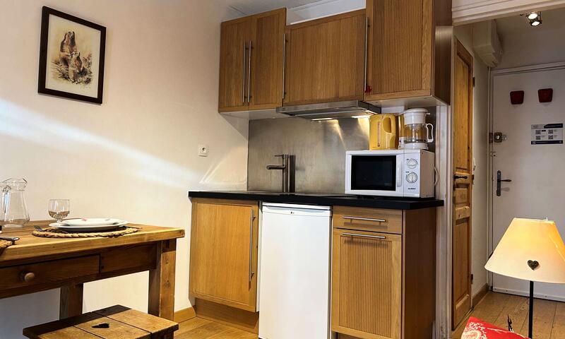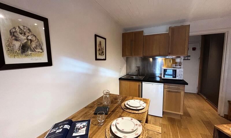 Cet appartement studio à la montagne situé au rez-de-chaussée haut comprend un séjour télévision (balcon ouest) avec un ensemble de 2 lits gigognes relevables, une petite cuisine, 1 salle d'eau avec WC. Accès au casier à skis - niveau entrée.