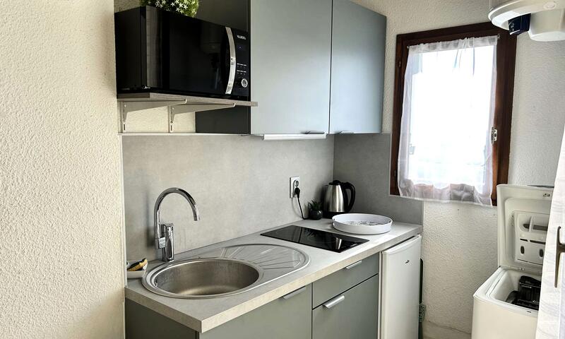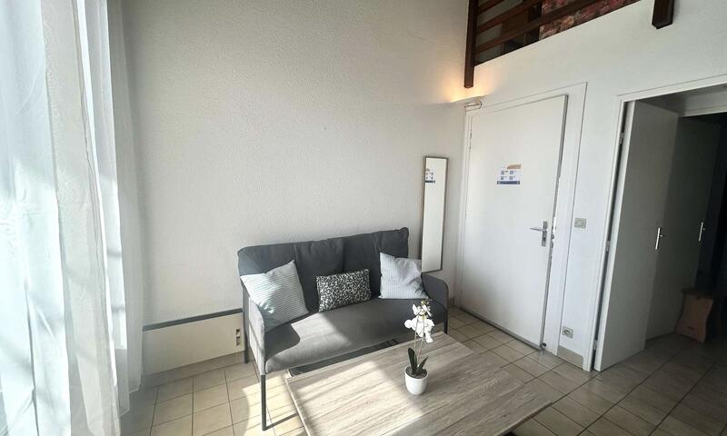 Ce logement de vacances situé en premier étage d'une petite résidence au calme, se compose d'un séjour avec coin cuisine équipée, une cabine avec deux lits une personne superposés, un WC, à l'étage supérieur: une mezzanine avec un lit deux personnes, une salle d'eau avec WC .