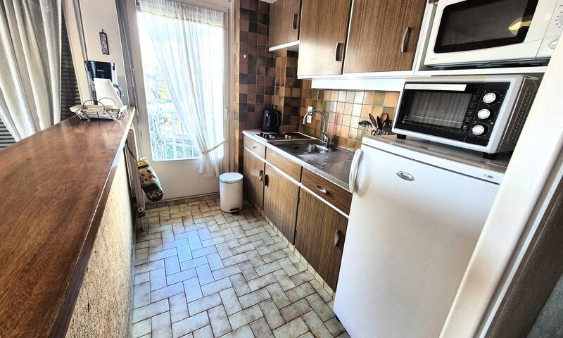 Cuisine américaine ouverte sur séjour (carrelage) : 2 pl électriques, four, micro-ondes, réfrigérateur congélateur, cafetière électrique, bouilloire, grille pain, vaisselle et batterie de cuisine