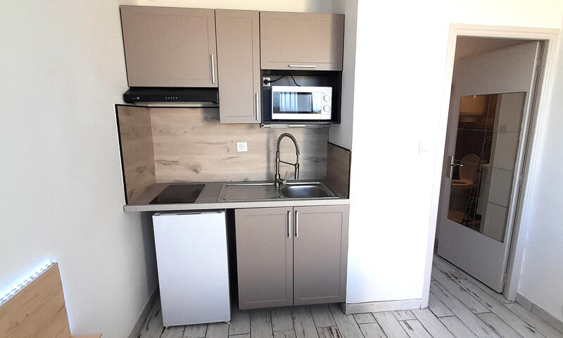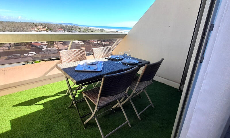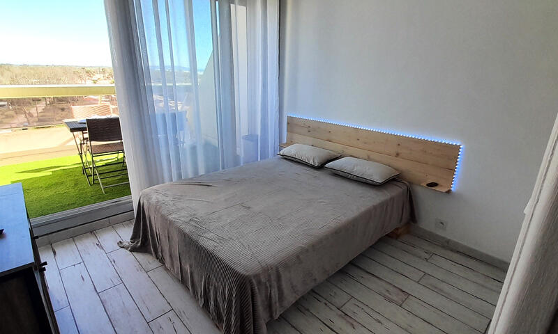 Studio 2 personnes rénové, situé à Héliopolis entrée L, au 4ème étage avec ascenseur. Séjour avec un lit en 140cm. Coin cuisine avec micro ondes, senséo, bouilloire, réfrigérateur, aspirateur... Salle d'eau et WC. Terrasse vue mer et camping. Parking n° 94