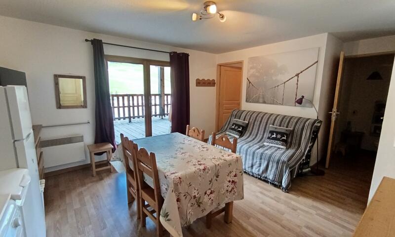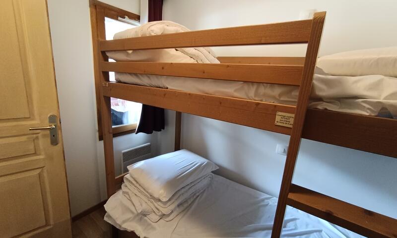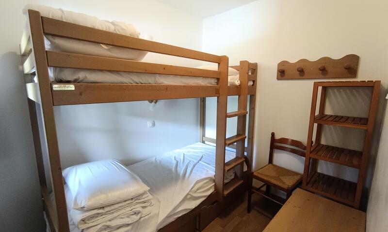 Coin montagne du séjour par une porte : 2 lits superposés 1 pers (80x190), fenêtre donnant sur la terrasse, étagères de rangement, patères.
