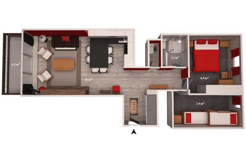 Ce 3 pièces exposé Sud de 57m², est équipé pour 6/7 personnes et situé au 4ème étage de la résidence de l'Ourse Bleue.