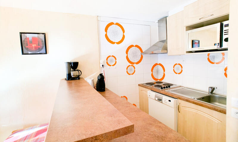 Kitchenette équipée de plaques électriques, lave-vaisselle et réfrigérateur.