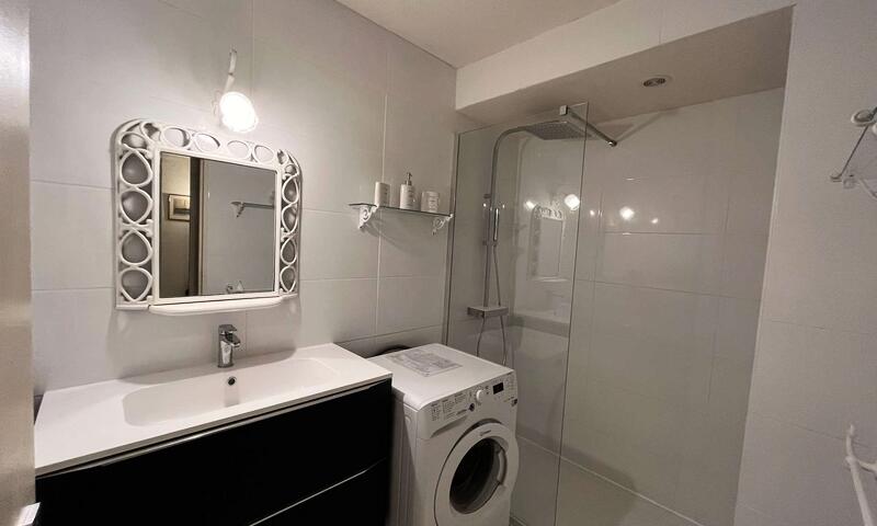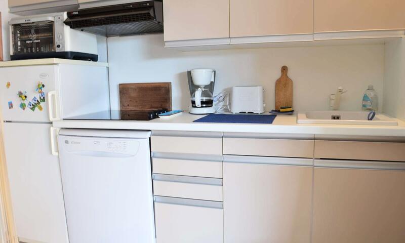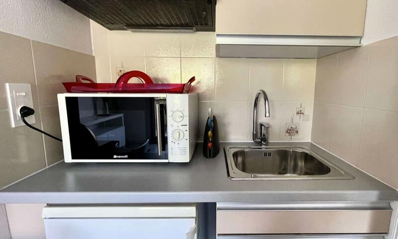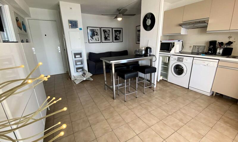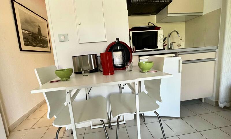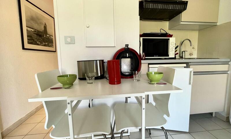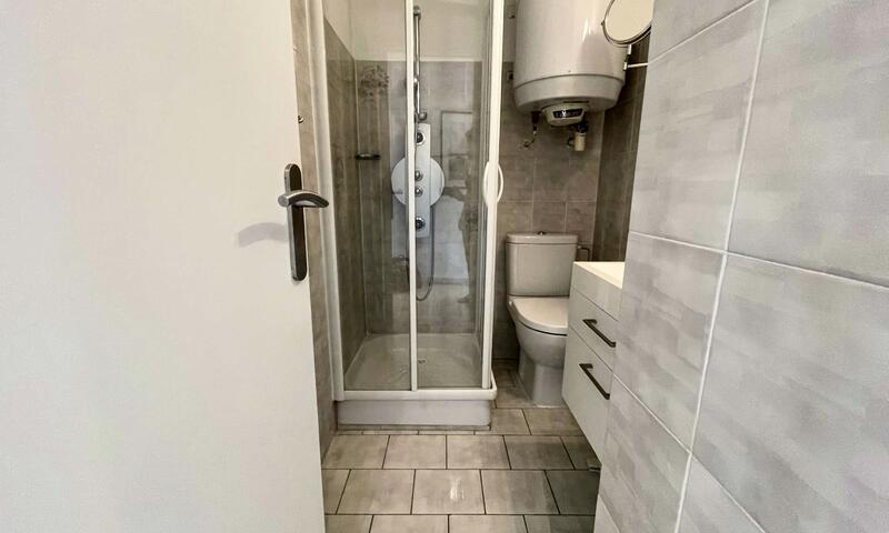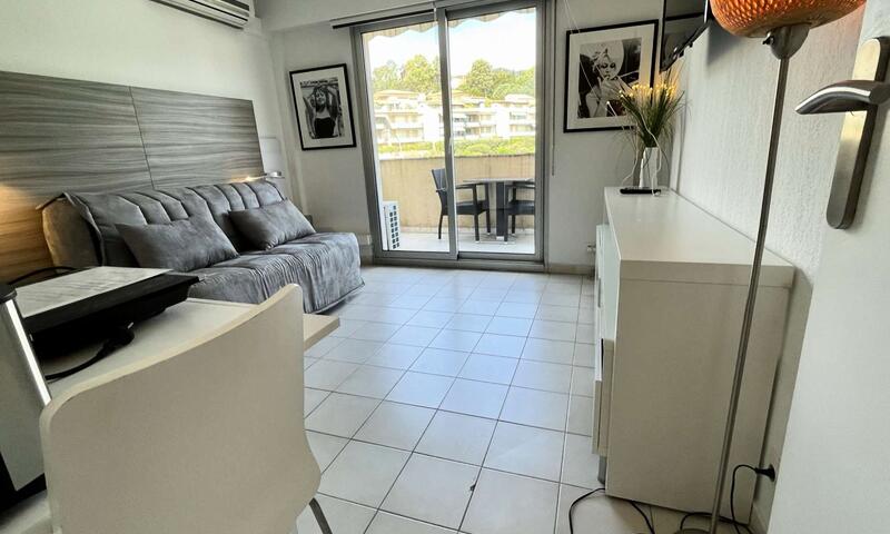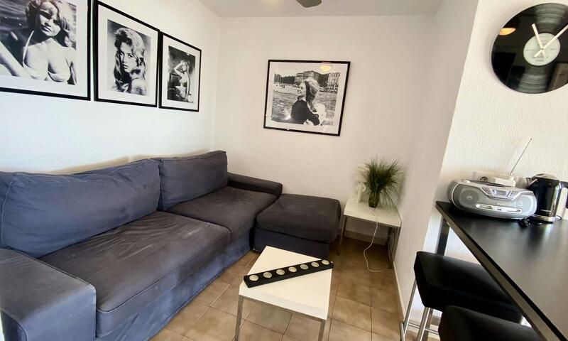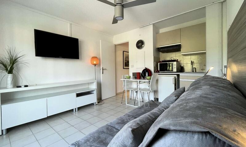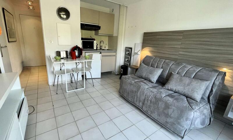 Ce studio climatisé de vacances se situe au 2ème étage, sans ascenseur, composé d'une pièce de vie avec un canapé type BZ 140cm, pouvant accueillir deux personnes ouvert sur une terrasse, d'une kitchenette équipée, d'une salle de douche avec un WC.