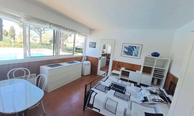 L'entrée donne sur la pièce de vie équipée de grandes baies vitrées qui s'ouvrent face à la piscine. Une kitchenette équipée est attenante.
