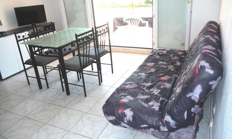 Séjour spacieux et lumineux aménagé avec un canapé convertible, une table, des chaises, une TV, et une climatisation. Idéal pour se détendre.